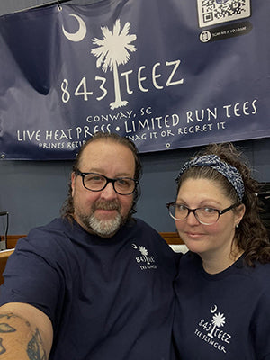Heather is a U.S. Army vet with a love of community and the anchor that keeps Todd grounded. Todd is a U.S. Air Force vet who brings the grit, the graphics, and a whole lot of caffeine. Together, we run 843 Teez — a small-batch, veteran-owned brand based right here in Conway, South Carolina.